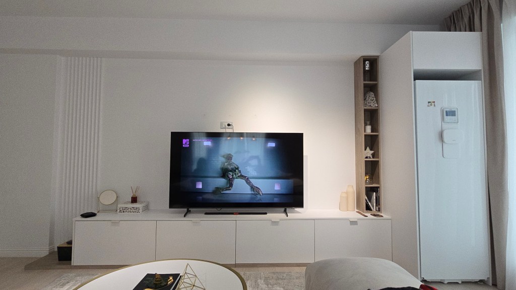 🌟Comodă TV, cu spațiu de depozitare și riflaje albe fine și discrete.