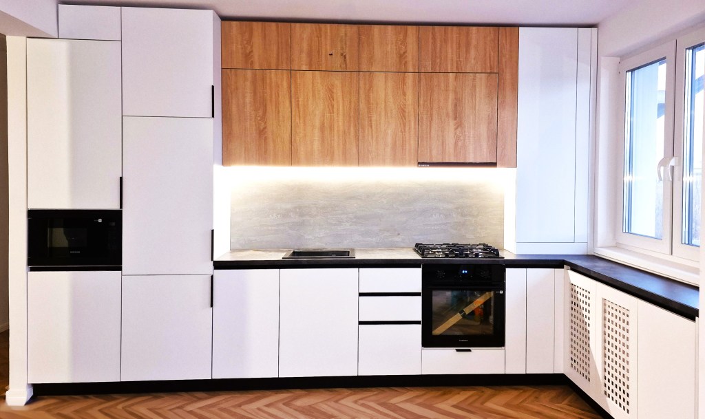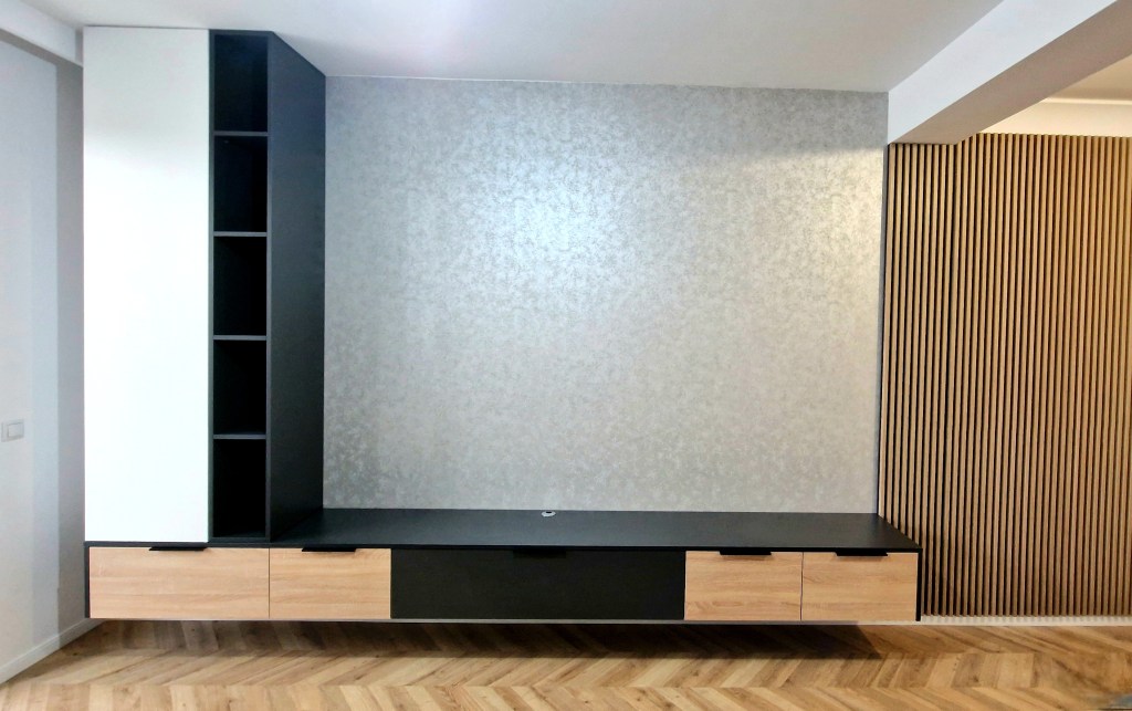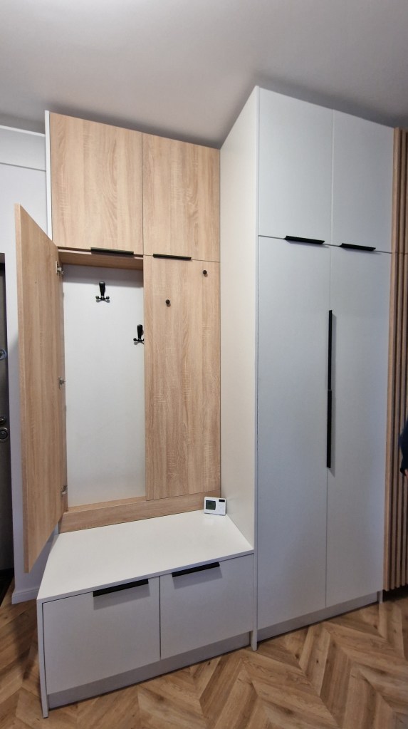 Ne plac mult ușile din riflaje din corpul cu mașina de spălat, spațiul este inchis, totuși vizibil și ușor de accesat.