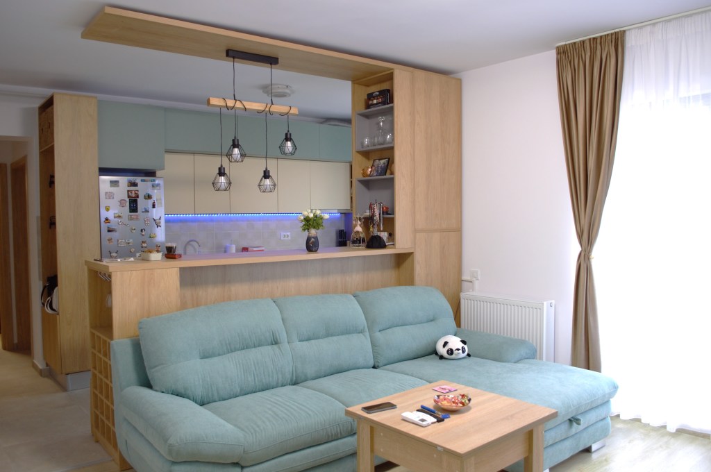 Cand bucataria si livingul este in aceeasi incapere solutia este un spatiu comun cum ar fi un ‘bar’.
