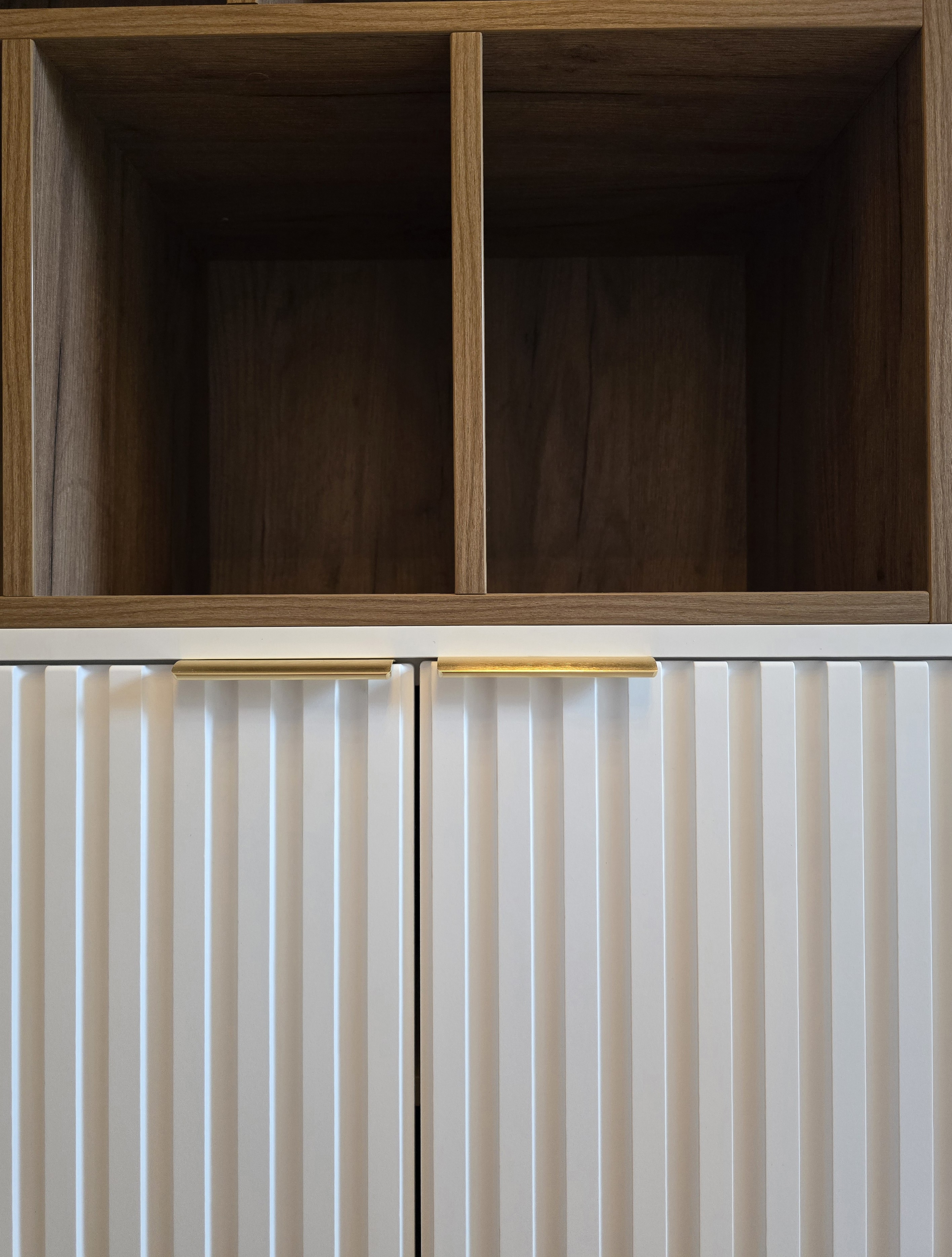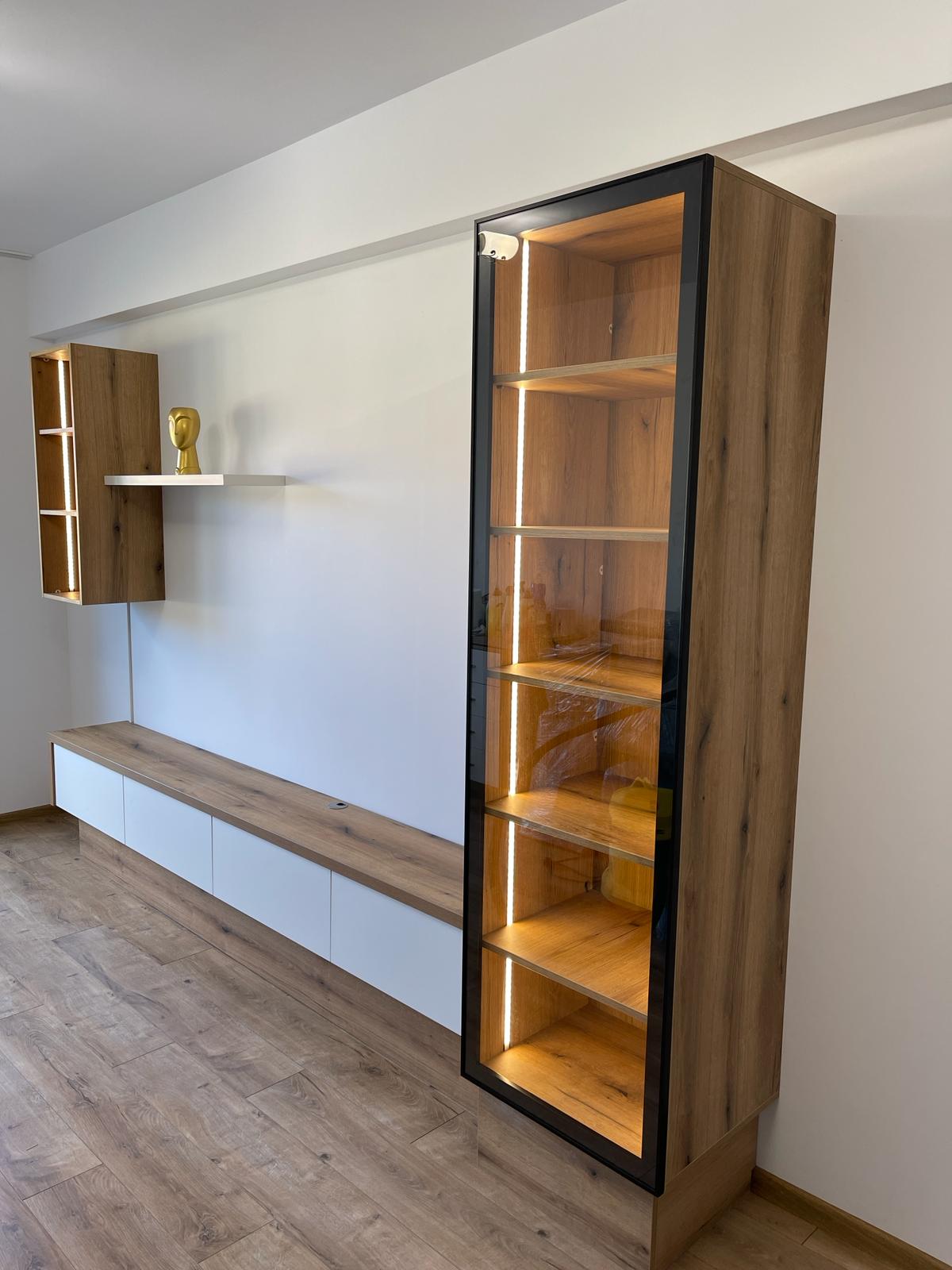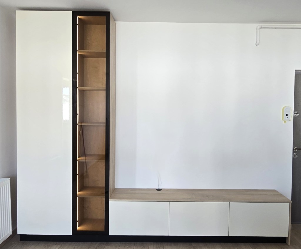 Culoarea deschisa confera spatiului luminozitate. In plus compartimentele de sub televizor sunt foarte utile ca spatiu de depozitare.