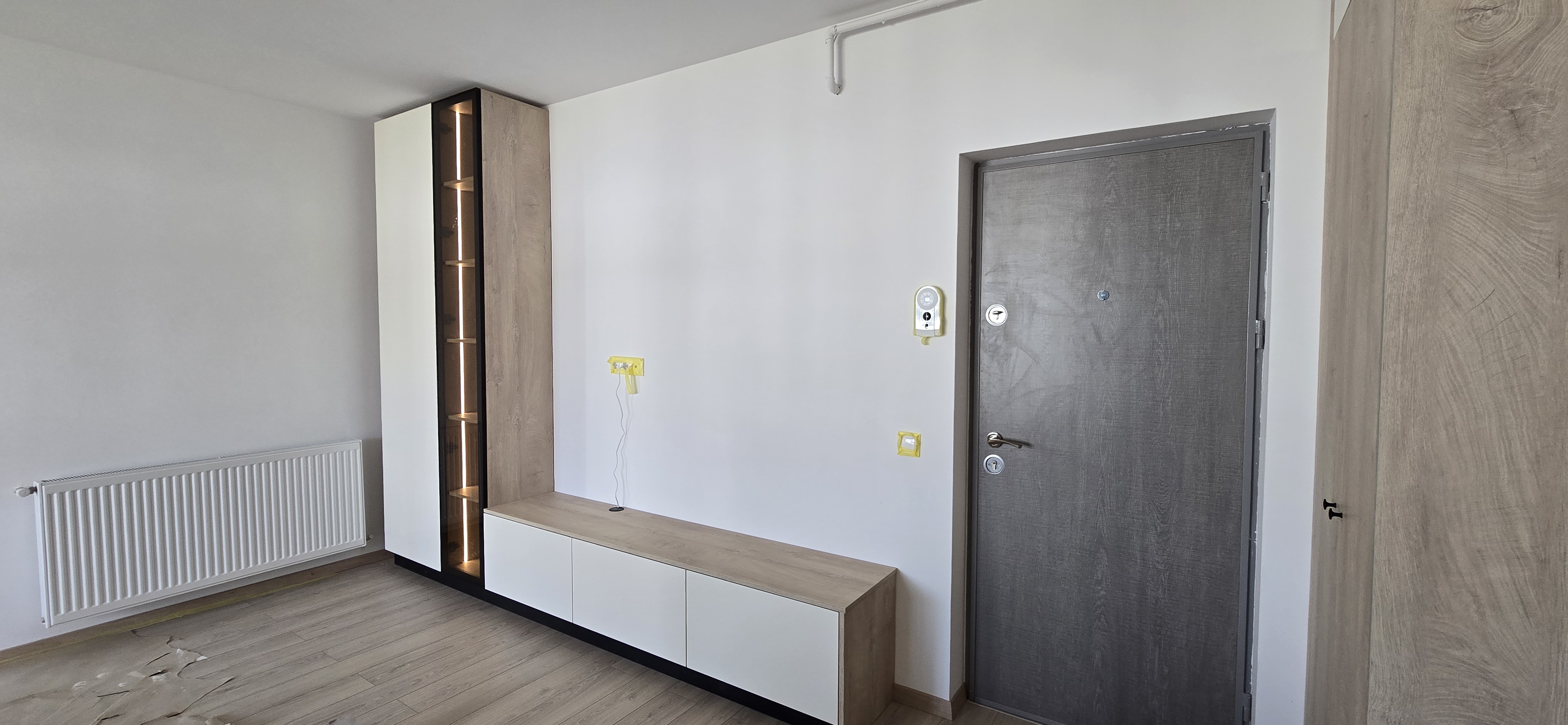 Intrarea este delimtată prin riflaje care separă zona de living, unde am integrat un șemineu electric intr-un corp din material din PAL texturat ca marmura neagră.