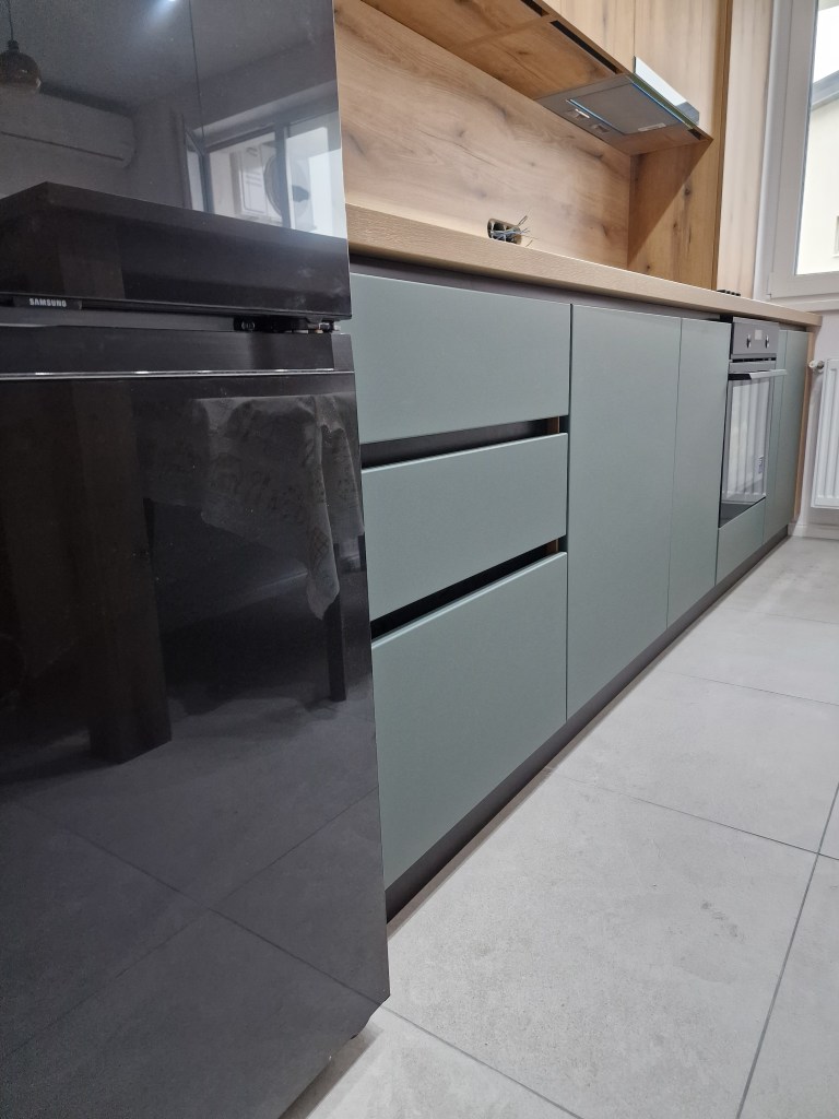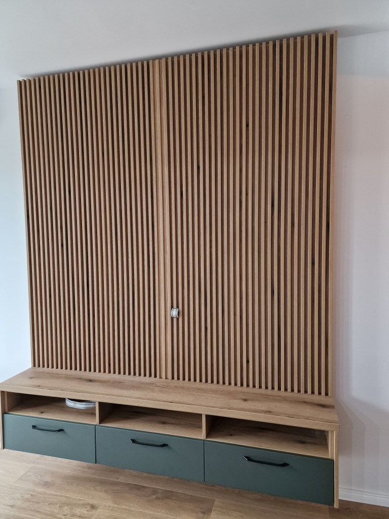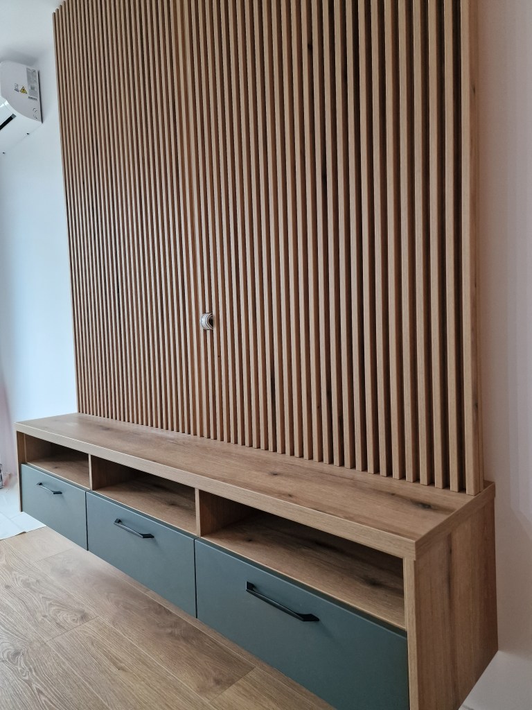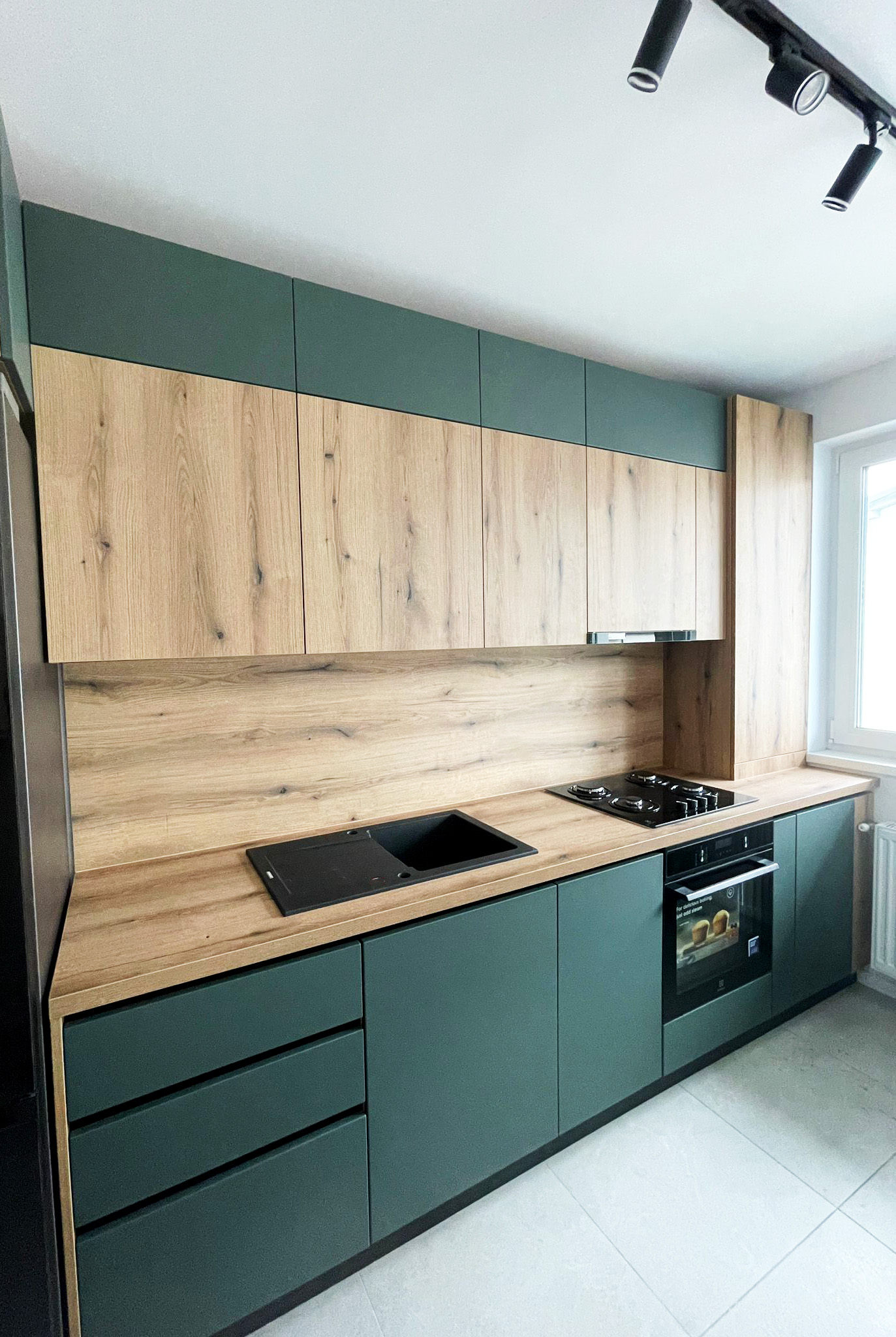 O locuință modernă cu #mobilalacomanda în texturi si culori naturale, lemn și verde, care combină estetica contemporană cu elementele naturale, creând un spațiu plăcut și funcțional.