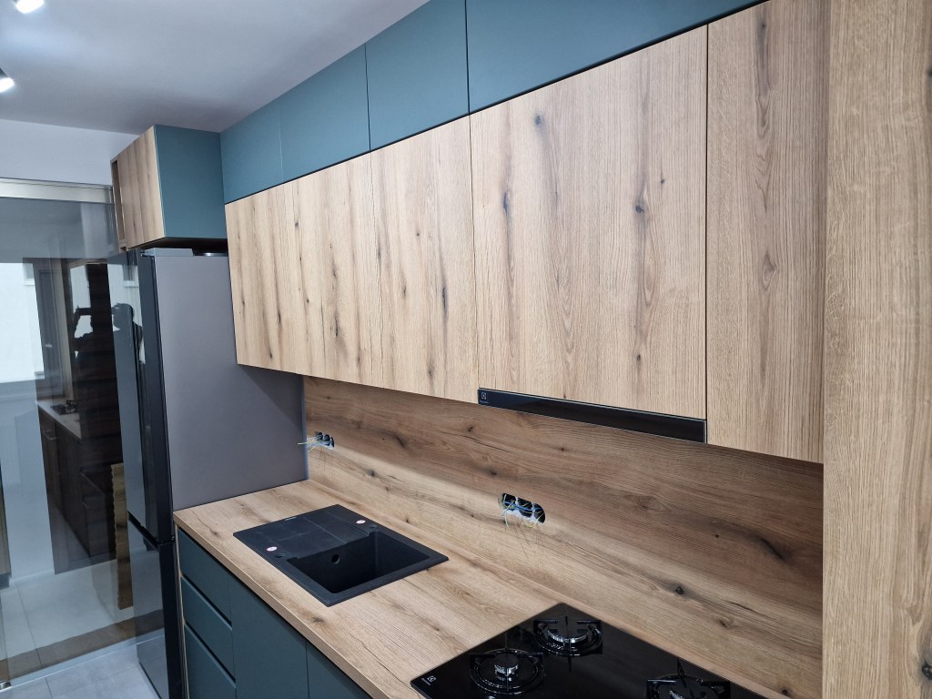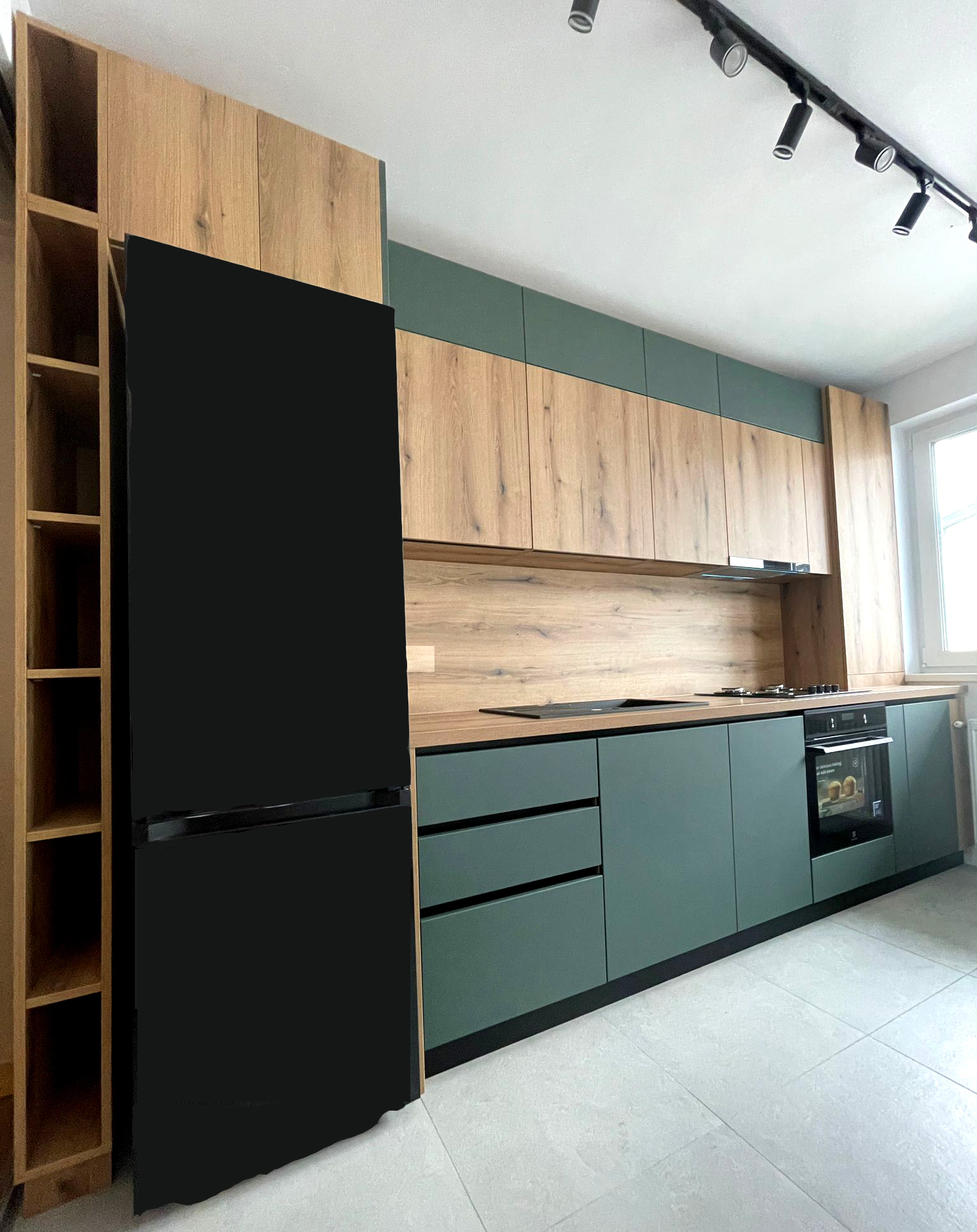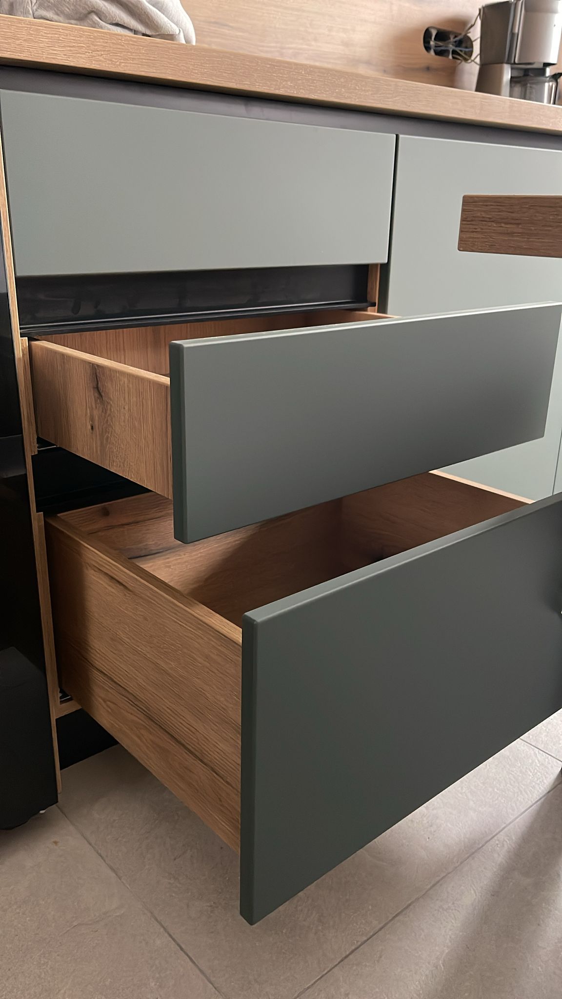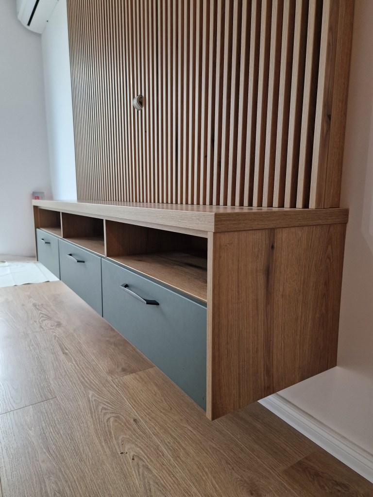 O locuință modernă cu #mobilalacomanda în texturi si culori naturale, lemn și verde, care combină estetica contemporană cu elementele naturale, creând un spațiu plăcut și funcțional.