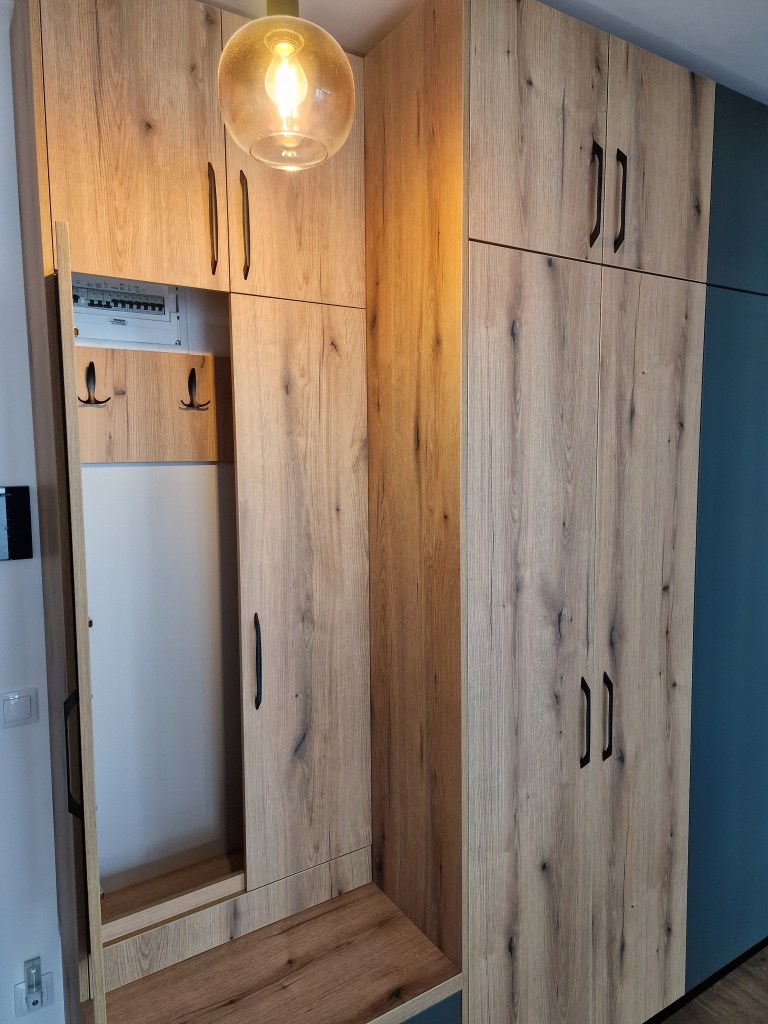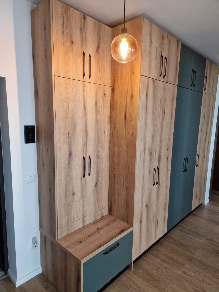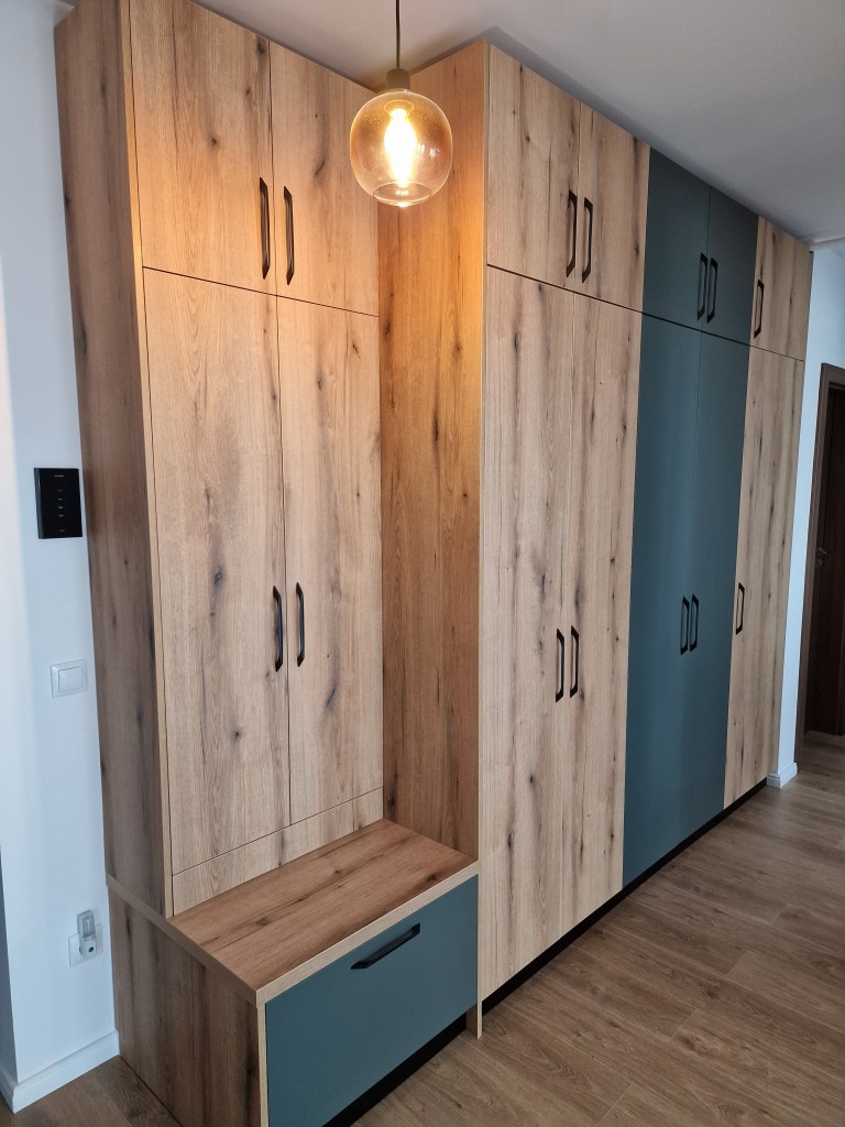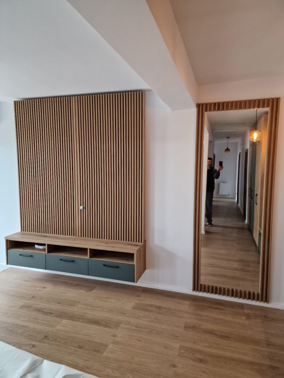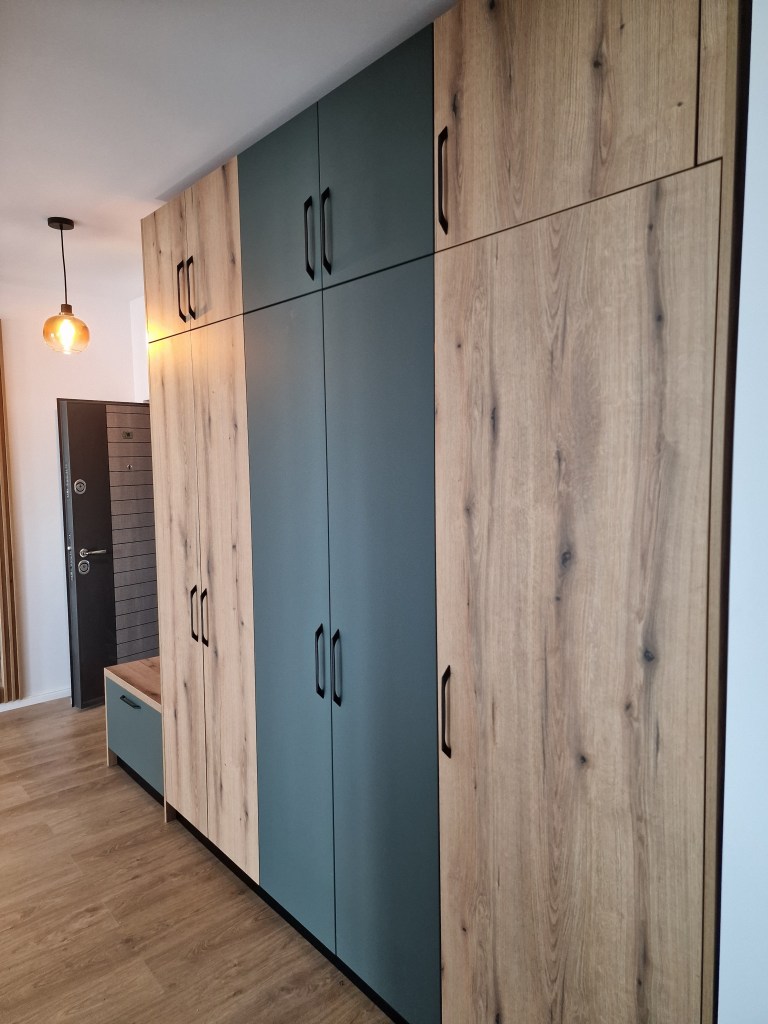 Dulapuri simple, din PAL, cu fronturi netede, cu mânere ascunse, pentru un aspect curat și aerisit.